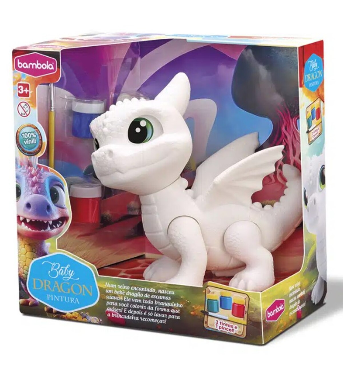 O kit completo inclui o boneco Baby Dragon, tintas vibrantes e um pincel, oferecendo tudo o que os pequenos artistas precisam para personalizar seu próprio dragão.
