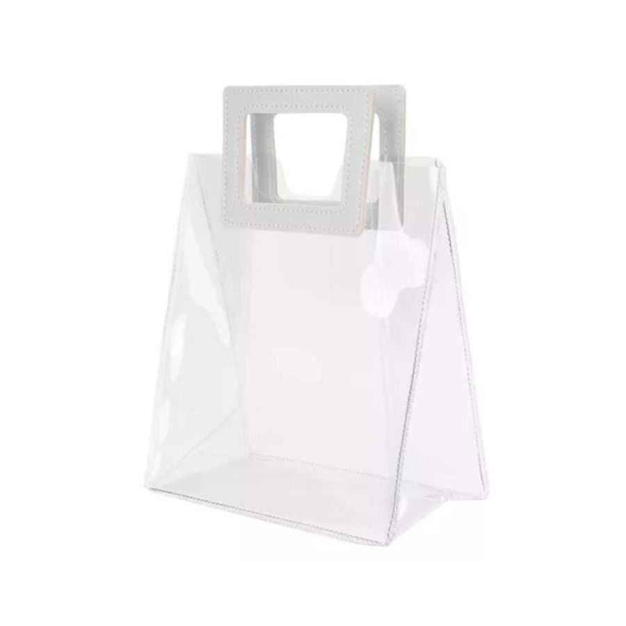 Transforme a apresentação dos seus presentes e produtos com essa exclusiva sacola quadrada transparente em PVC, equipada com uma sofisticada alça quadrada em couro sintético. A combinação de design moderno com acabamento premium garante um visual elegante e refinado, ideal para diversas ocasiões.