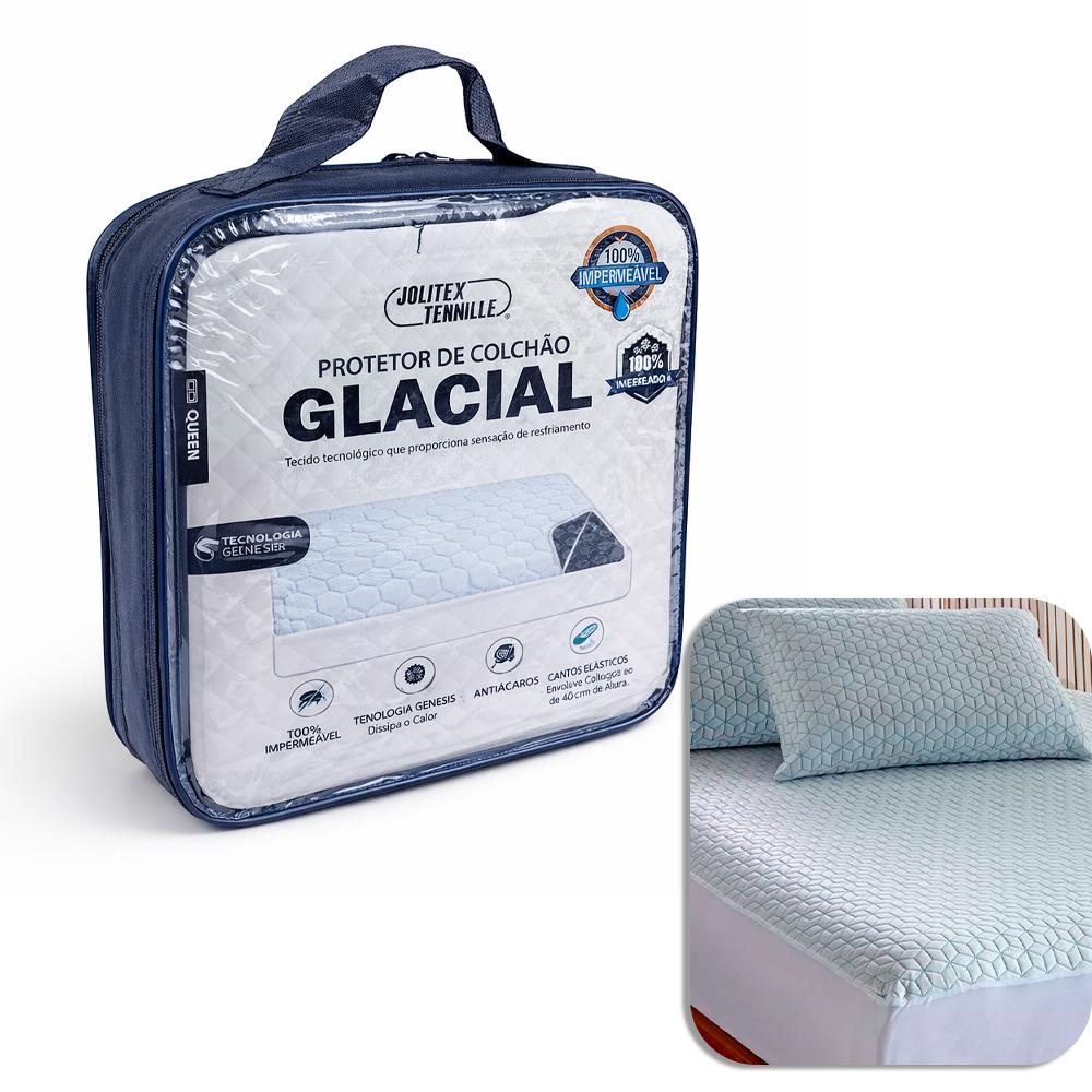 Protetor de colchão queen impermeável | Protetor colchão Jolitex Glacial | Protetor com toque gelado | Protetor térmico queen | Protetor antiácaro queen | Protetor com tecnologia Genesis | Protetor queen silencioso e impermeável