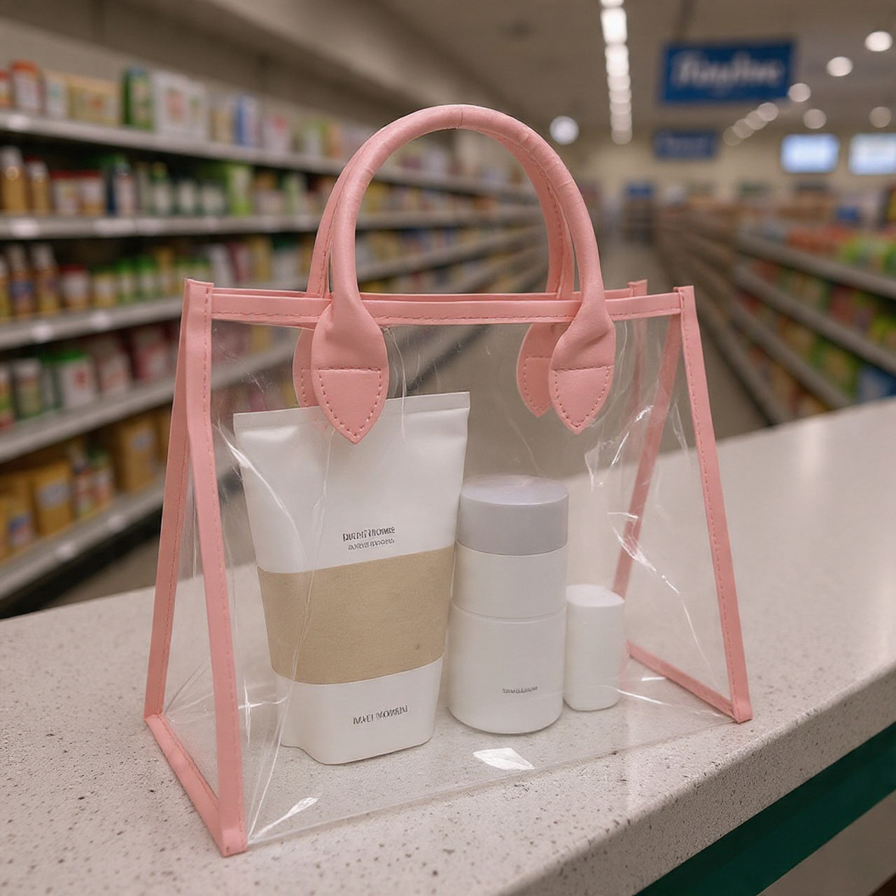 Sacola Transparente de PVC com Alça em Couro Sintético Rosa – Sofisticação, Resistência e Versatilidade