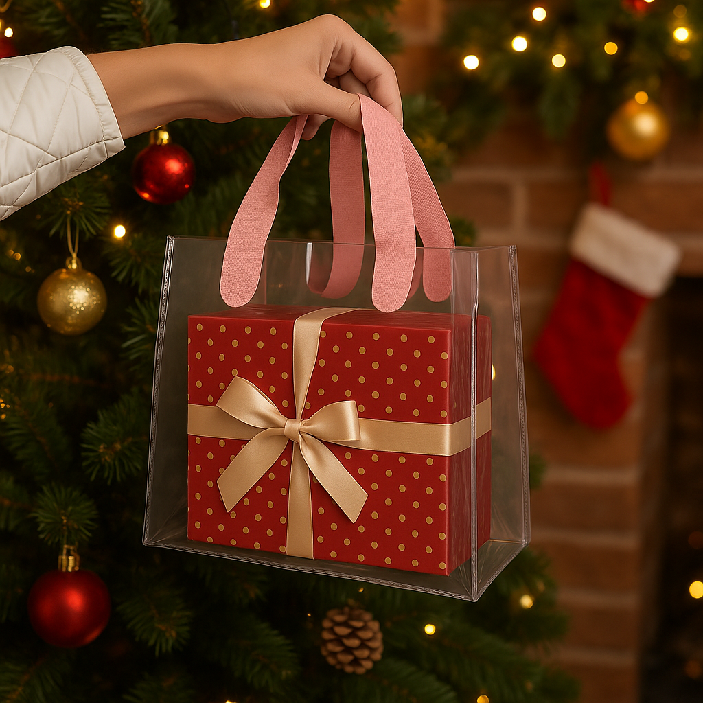 Sacola transparente pvc luxo, sacola para presente elegante, embalagem com alça couro sintético, sacola decorativa premium, lembrancinhas casamento, brindes personalizados, kit sacola para loja, embalagem para eventos, sacola reutilizável sofisticada.